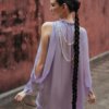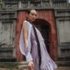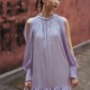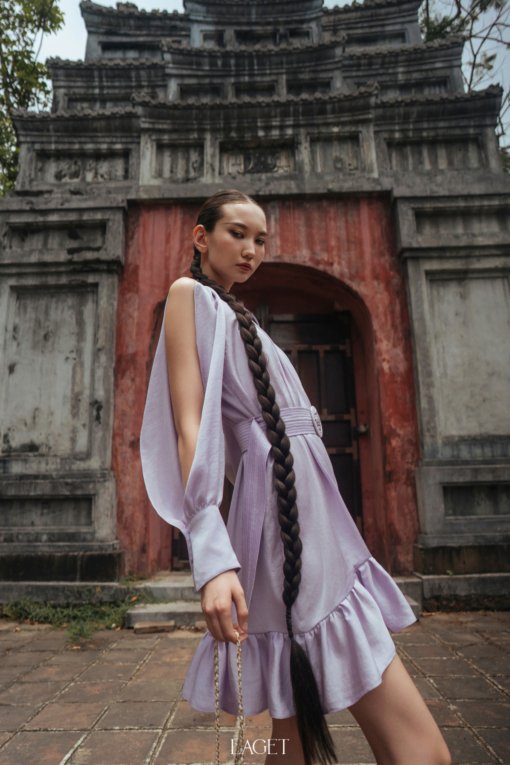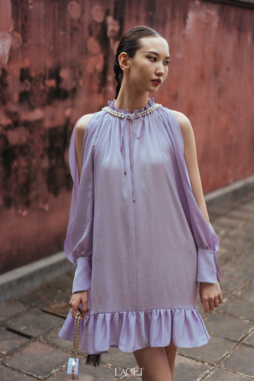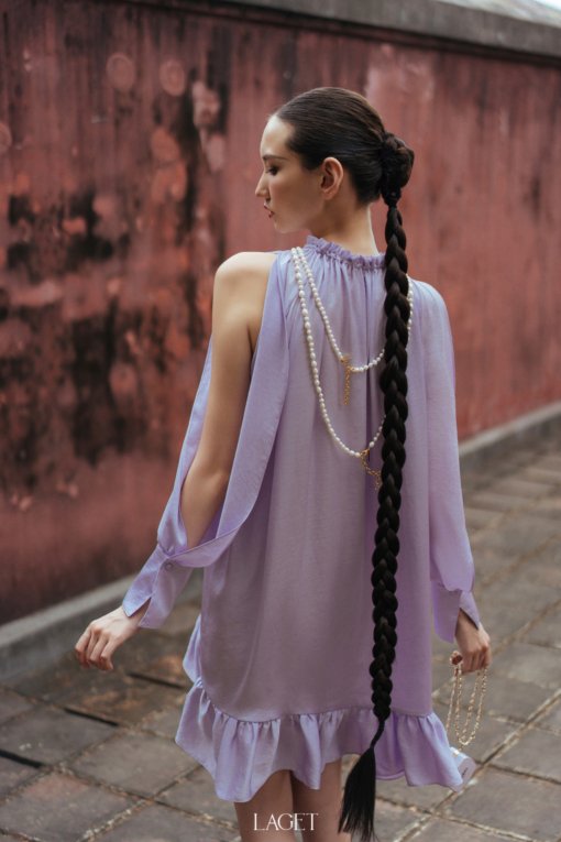 Dầm suông tím ngắn có phần bèo làm điểm nhấn. Phần tay áo xẻ tà. Có thể mặc được hai kiểu khi kết hợp với thắt lưng bằng chính vải, tạo cảm giác vòng 2 nhỏ nhắn. Phần cổ váy có chi tiết bèo nhún và dây buộc. Mặc được hai kiểu