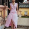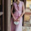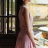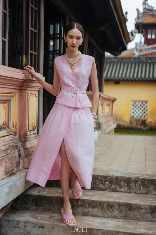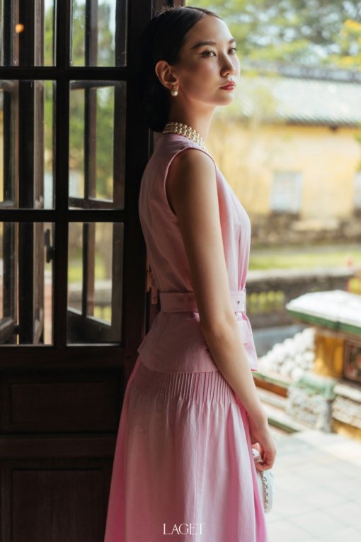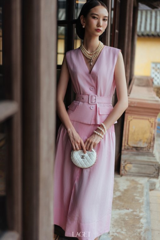 Đầm hồng có phần thân trên là dáng áo blazer cộc tay. Có phần nắp túi và hàng cúc dọc thân trước. Thắt lưng cùng tệp màu và chất liệu có thể mặc đươc 2 kiểu. Phân thân dưới dáng suông, có phần ly làm điểm nhấn
