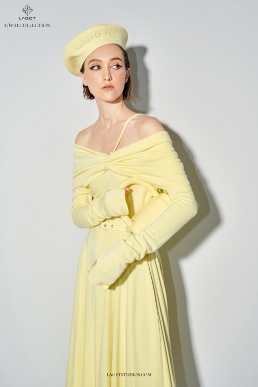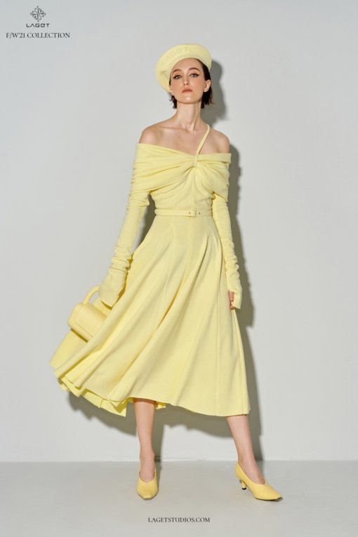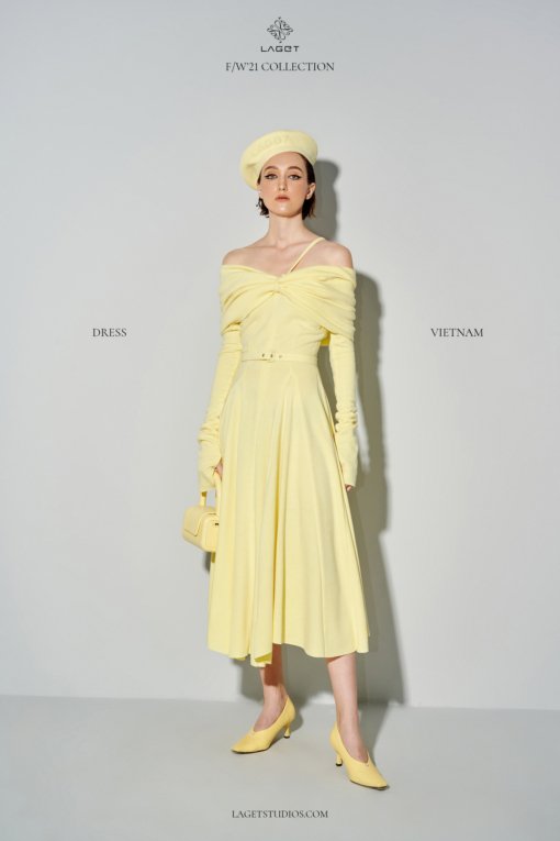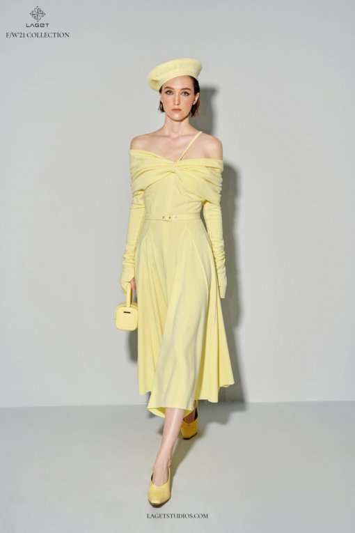 Đầm dáng midi dáng dài. Thiết kế drap xếp 3D trên phần cổ ngang vai và đường bổ cúp và xếp tam giác dọc thân đầm.