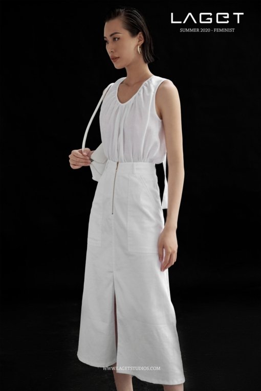 Chân váy dáng midi cạp cao có khóa kéo và xẻ tà phía trước. Chất liệu khaki cao cấp.