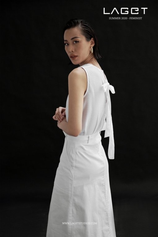 Áo không tay có đường cổ xếp rún cách điệu với thiết kế thắt nơ phía sau áo. Chất liệu cotton cao cấp.
