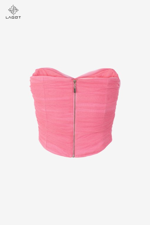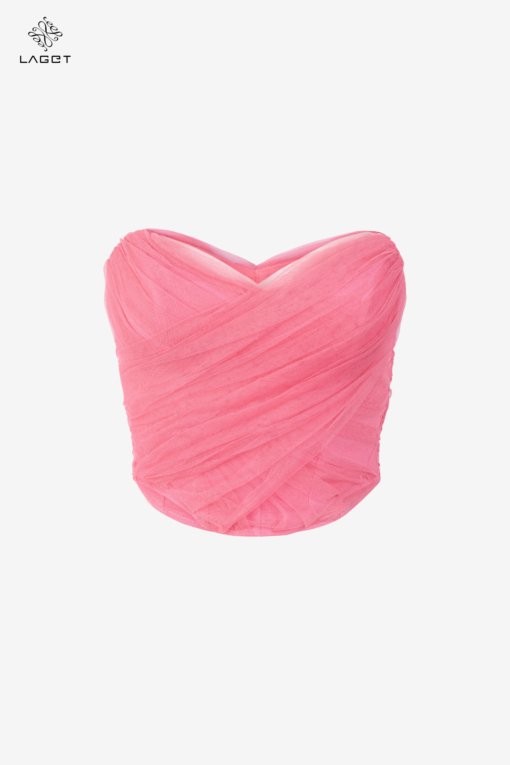 Áo corset dựng form và xếp phủ bằng hiệu ứng drapping 3D thủ công giúp định hình form dáng người mặc tôn vòng 1, gọn vòng 2.