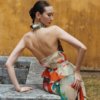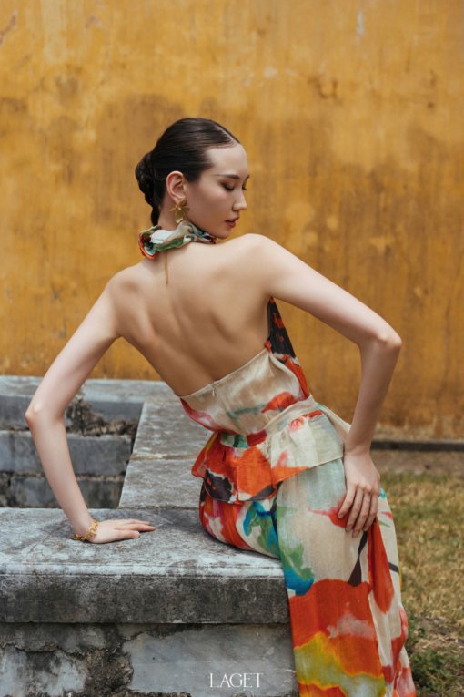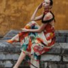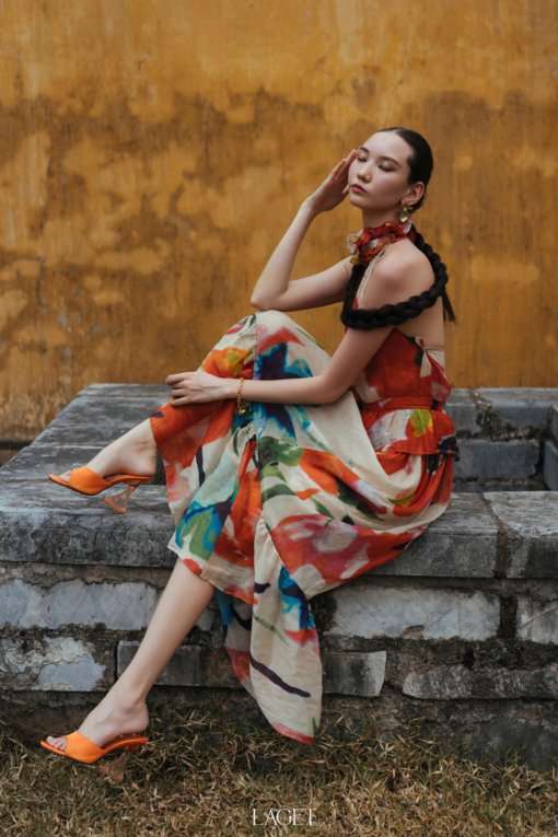 Đầm tơ họa tiết dáng suông dài đan xen các màu trắng, cam, xanh. Phần ngực khoét sâu. Cổ áo và phần eo được thiết kế có thêm phần bèo nhún