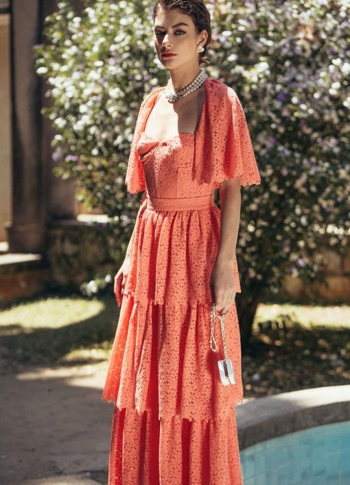 Áo poncho khoác ngoài giúp người mặc che bắp tay. Áo cup ngực có độ dài đến eo, dưới lớp nền áo có gọng cứng giúp định hình cho người mặc. Chân váy midi cạp cao giúp tạo hiệu ứng eo nhỏ, chân váy xếp 3 tâng bèo nhún.
