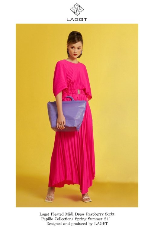Đầm dập ly phom dáng maxi dài tay liền, phần volume rộng ở trên, thắt eo và xòe dưới.