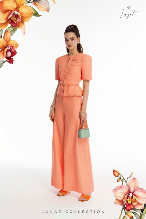 Jumpsuit hoa lan táo bạo, nhưng lại là tuyên ngôn của sự dịu dàng trưởng thành. Đường cắt khéo léo tôn vinh dáng mà không cần gồng mình, từng nếp gấp, từng chuyển động nhẹ đều như lời thì thầm của người phụ nữ tự tin, bản lĩnh.