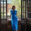 Đầm xanh có phần thân trên là dáng áo blazer, Có thiết kế vai chờm giúp che bắp tay,. Có thắt lưng cùng tệp màu và chất liệu tạo điểm nhấn. Có hai hàng cúc hai bên và nắp túi làm trang trí