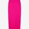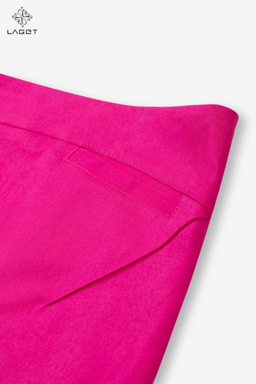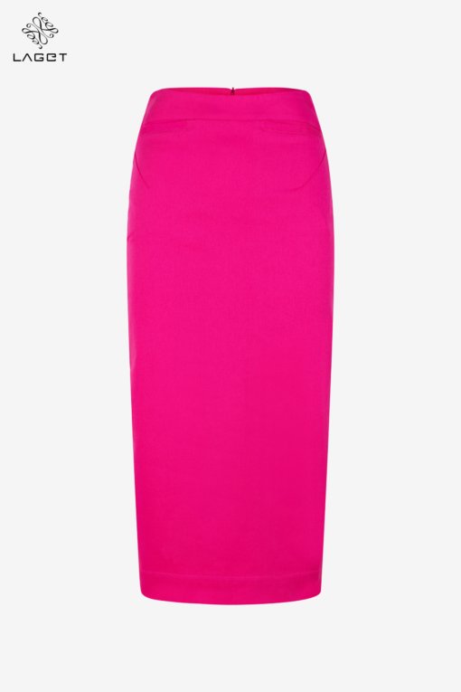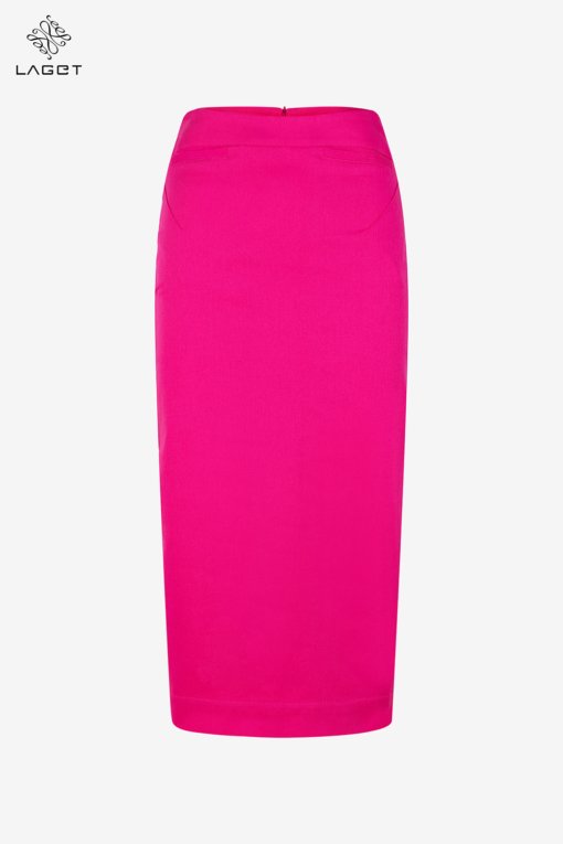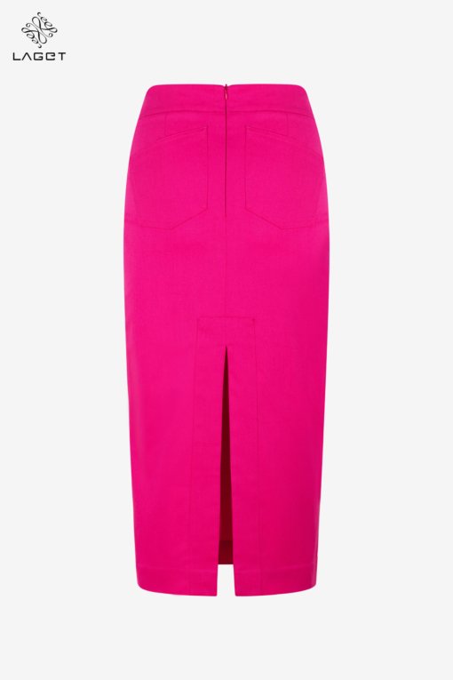 Chân váy cạp cao dáng midi. Có đường cúp hình trăng khuyết, kết hợp 2 túi.
