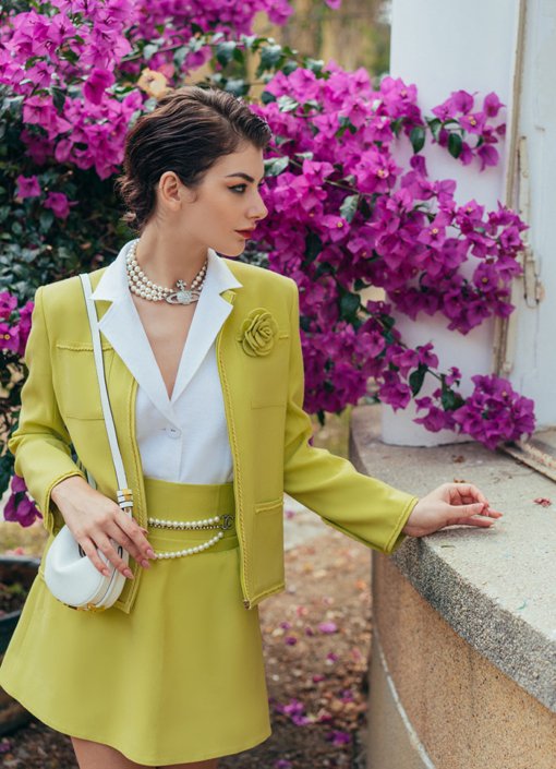 Áo khoác cổ tròn, dáng vừa, được trang trí thủ công quanh viền áo, gấu tay tạo điểm nhấn cho trang phục.